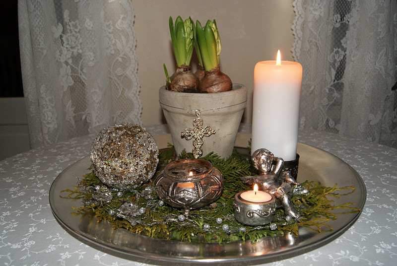 Jeg bytter litt rundt på mine fat. Liker å ha kubbelys kombinert med fargerike lysglass (har en kasse full av diverse lysglass), lysestaker, vase med eller uten blomst(er), små potter med en bitteliten sukkulent eller annen liten plante, små skåler, ting ungene har laget etc.