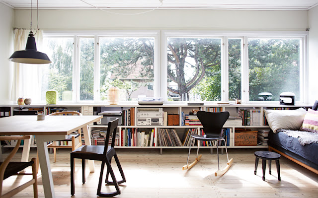 Sv: Gardiner på stua. En interiørkriseJeg har bygget lave bokhyller i vår karnapp, og det er virkelig veldig fint, det blir så lunt! Det blir lettere med belysning også, for man kan sette lamper på hyllene.