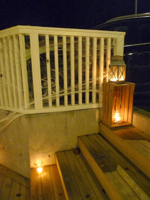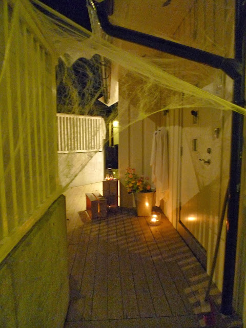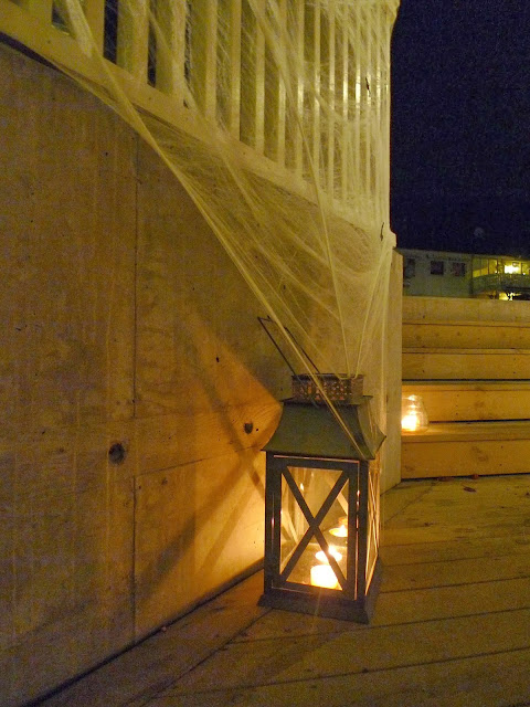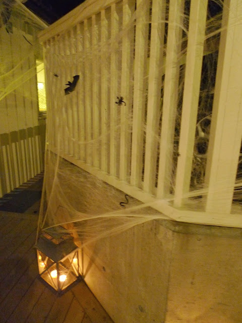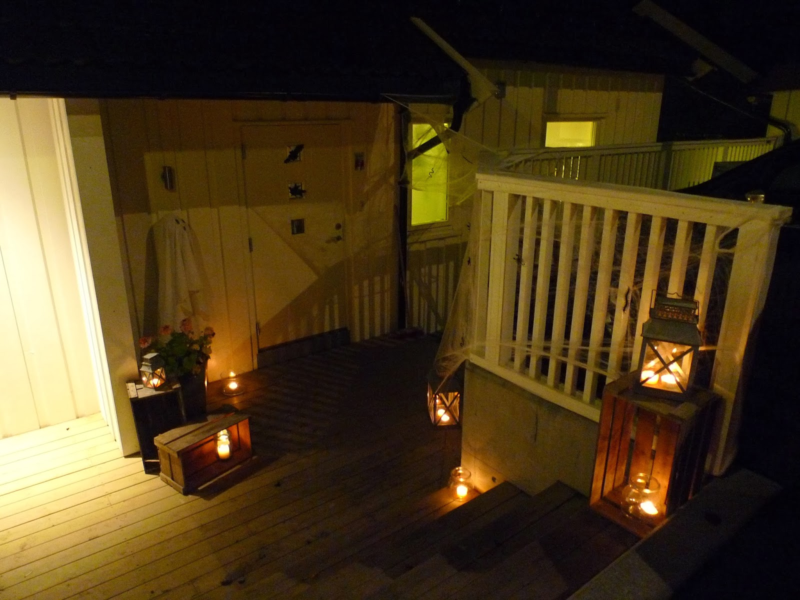 Sv: HalloweenpyntetrådenTøft! Naboen hadde fest og hadde spøkelser, edderkoppnett og maser lykter.