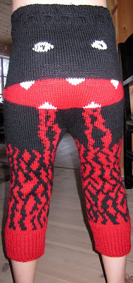 Mini kom hjem fra skolen her også med flere bestillinger fra kompiser, men ehm - da tror jeg kanskje at jeg tar ett strikkekurs for mødrene istedenfor.. Han skulle ha monsterbukser med BLOD - masse blod som rant nedover munnen og var schikkli skumle... Så på de er det mye brodering.