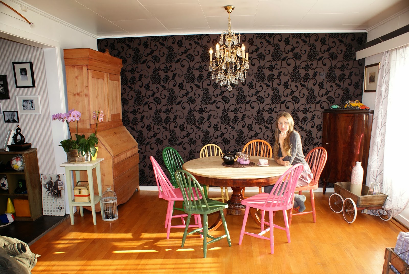 Sv: Hvilke spisestoler har dere?Vi har budalstoler som har dukket opp i bo og loppiser. Ett par har jeg malt selv, andre er som vi fant dem |