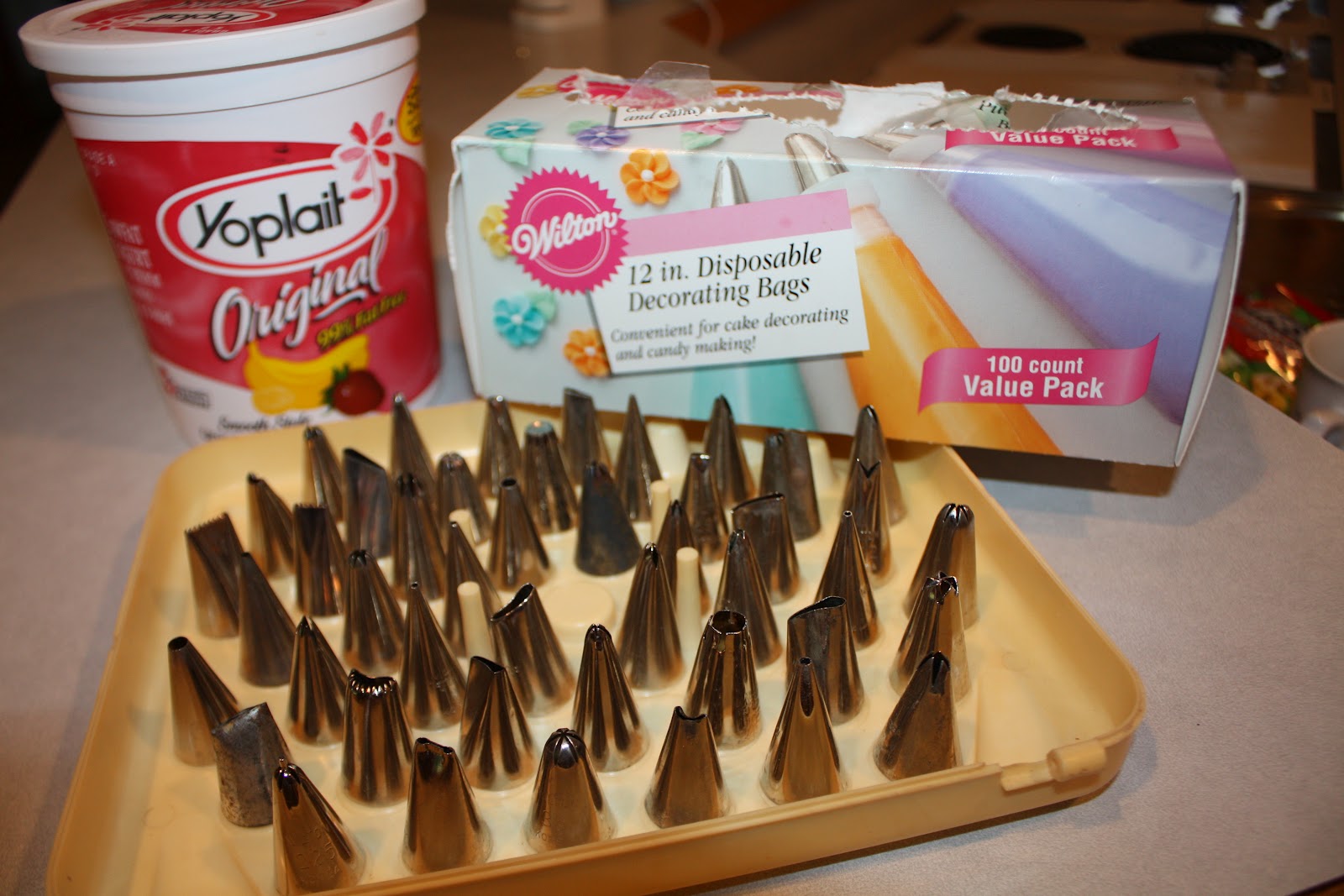 Sv: Med teskje- pynt av muffins til 5-årsdagJeg kjøpte noe billig i en matbutikk en gang. Det er en pakke som ligner pakkene med Glad Pack og sånt. Husker ikke hva det heter. Det er tre plastikk-tuter og noen poser nedi der. Endestykkene vaskes og brukes flere gsnger. Det er utrolig enkelt å lage fin glasur med det utstyret! |
