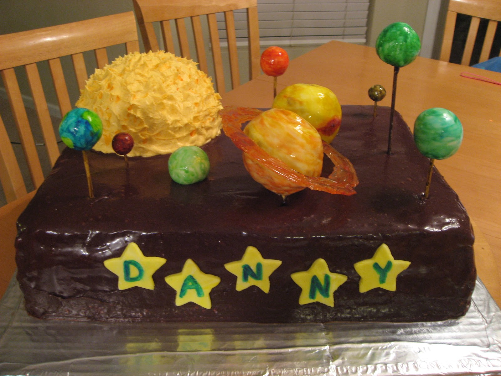 Sv: Kake med verdensrom-temaHva med å lage sjokoladekake med stjernebilder av sølvkuler?