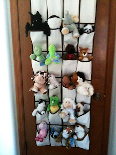 Vi har hengt en gardinstang på veggen med slike gardinringer med klyper på. Et kosedyr på hver klype-ryddig, tilgjengelig og dekorativt.
